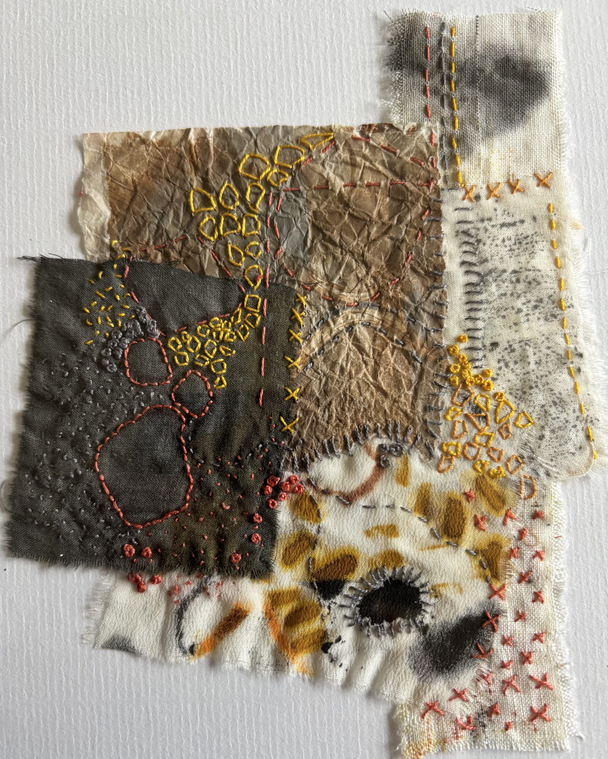 Gill is a textile artist, keen to experiment. Her work is inspired by finding objects on the beach or on local walks. Gill’s work is abstract, making use of limited colour palettes, and a range of materials, including paper and silk, which are hand printed and stitched.