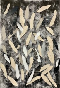 Katy’s practice begins with drawing and extends into collage, monoprint, and three-dimensional forms. Her approach is to gather, research and assemble in various ways. She enjoys exploring shape and mark-making through a variety of media.