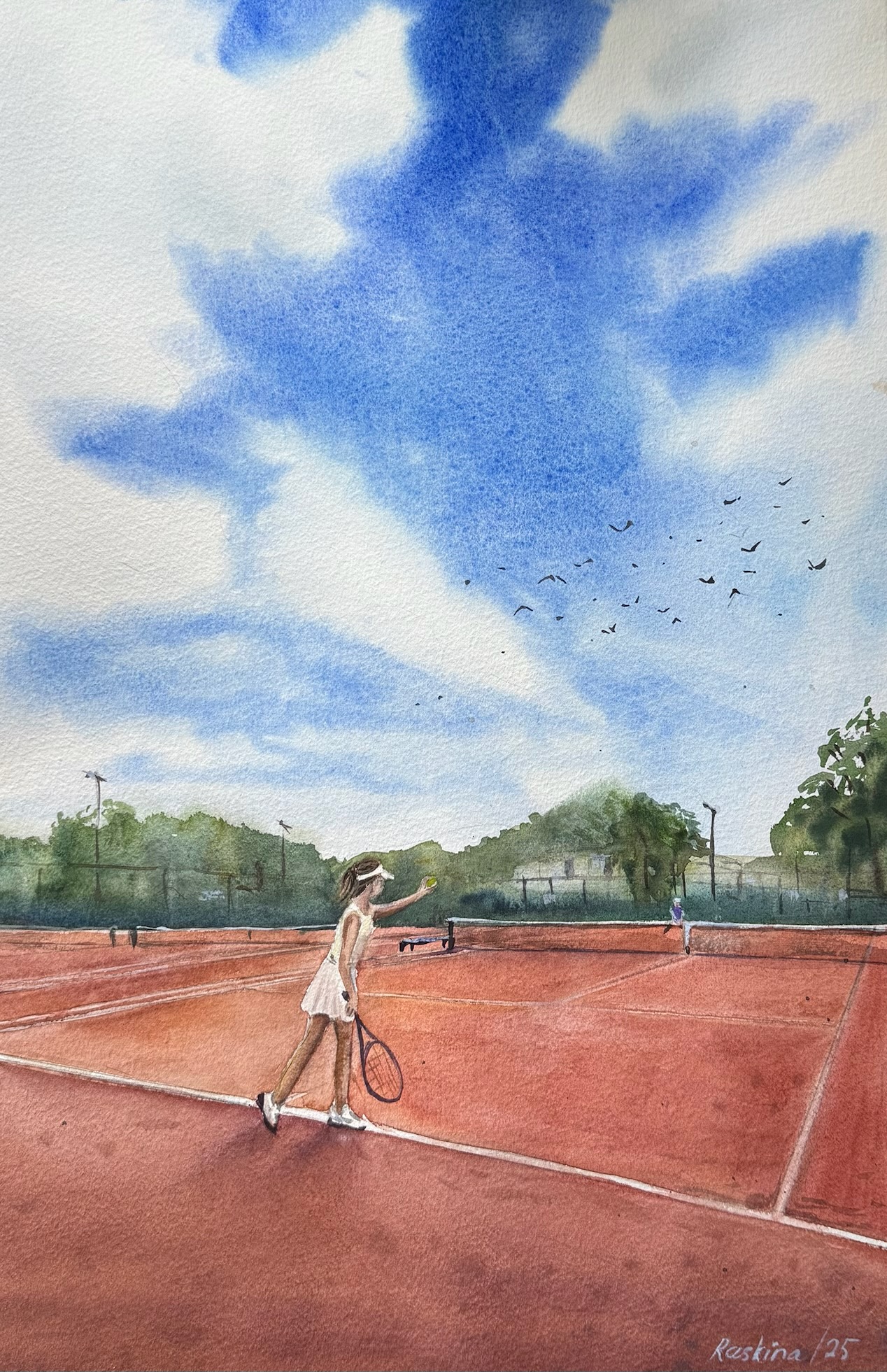 Maria lives in Harpenden and is passionate about tennis. She plays at the local club and expresses her love for the sport both on the court and through her paintings.