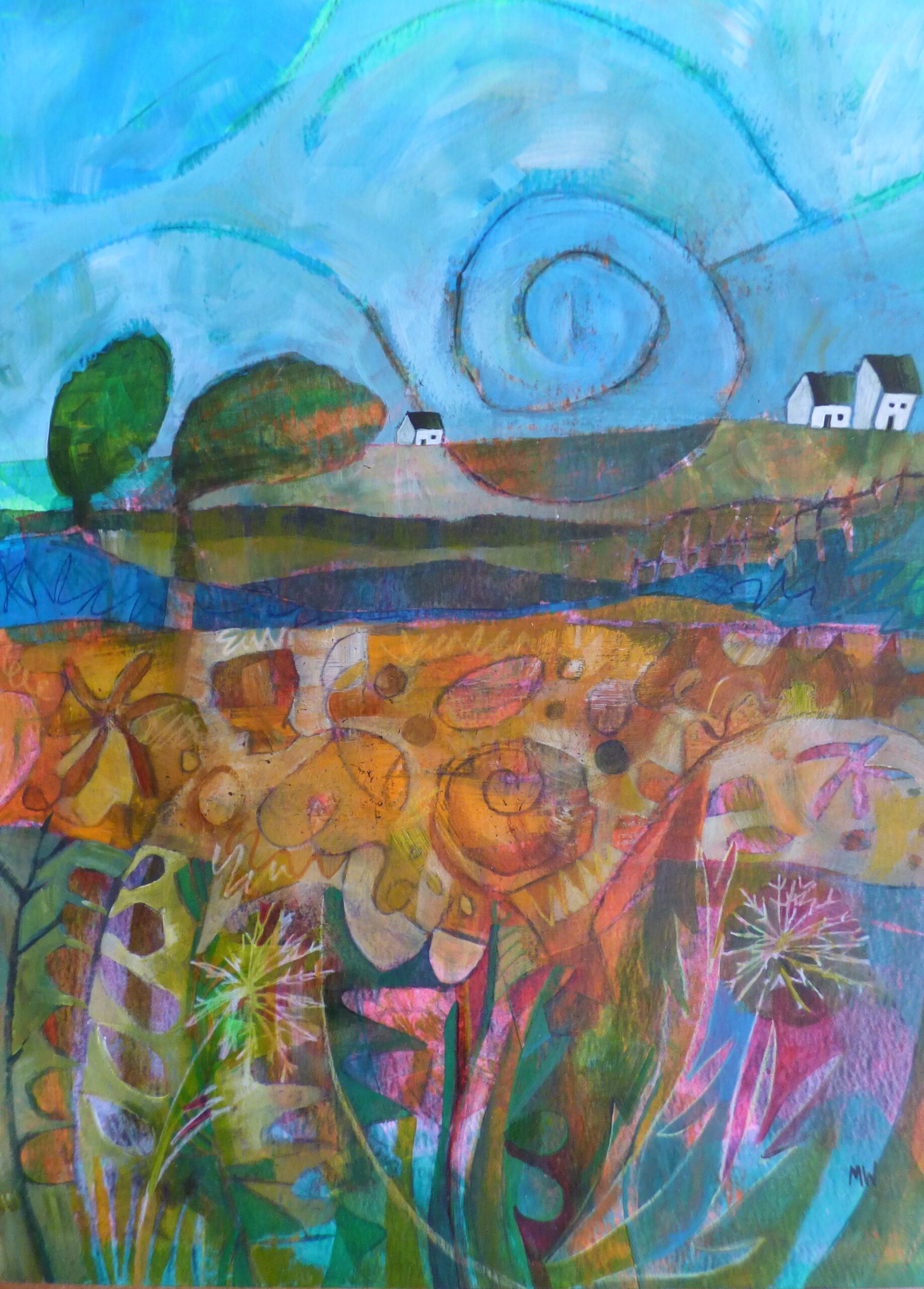 Colour, pattern and shape are integral to Tilly’s work. She uses layers of acrylic paint to create uplifting images of real or imagined landscapes and floral still life.